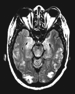 Her white blood cell count is 14,800/μL with a normal differential. Her red blood cell and platelet counts are normal. Serum chemistry, liver function, and coagulation test results are normal. Urinalysis reveals a protein level of higher than 500 mg/dL. A T2-flair image from an MRI scan is shown here.