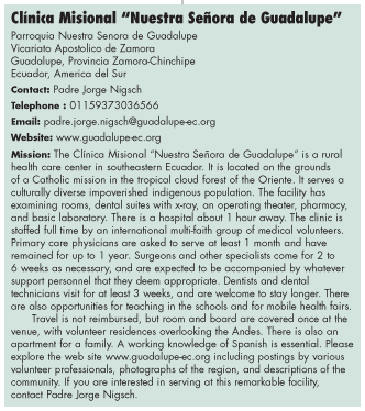For more information about the Clínica Misional “Nuestra Señora de Guadalupe,” visit www.guadalupe-ec.org. To serve at this remarkable facility, contact Padre Jorge Nigsch at padre.jorge.nigsch@guadalupe-ec.org. ■