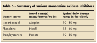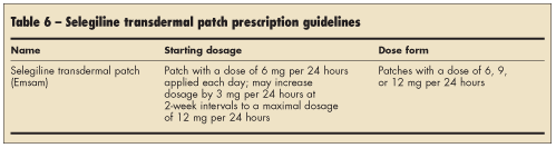 The MAOI selegiline, which is used as an adjunctive treatment of Parkinson’s disease, is currently available as a transdermal patch (Emsam) and has been approved by the FDA for the treatment of major depression in adults.25 Some clinicians also use it for treatment-resistant depression in the elderly. A summary of its prescription guidelines are outlined in Table 6. Unlike oral MAOIs, which exert MAO-A and MAO-B actions, transdermal selegiline is an MAO-B, which delivers antidepressant concentrations to the central nervous system without substantially impairing gastrointestinal MAO-A activity so that at the target dose of 6 mg per 24 hours, tyramine dietary restrictions are not needed.25 However, at a dose above 6 mg per 24 hours, it would lose its MAO-B selective action, thus requiring the institution of the tyramine dietary restrictions.25,26