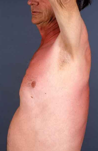 This pruritic eruption developed on a 62-year-old man's neck and upper chest after he had mowed his lawn. He has not started any new medications, and he has no recent history of contactant exposure. He did not mow any new sections of his yard.