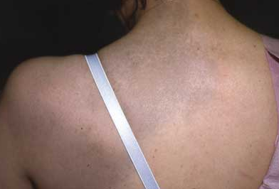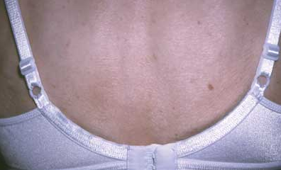 For several years, a 49-year-old woman has had persistent pruritus just lateral to the midline of her mid-back. She is unaware of any exacerbating factors. She has tried wearing a different type of bra, but her symptoms have not abated.