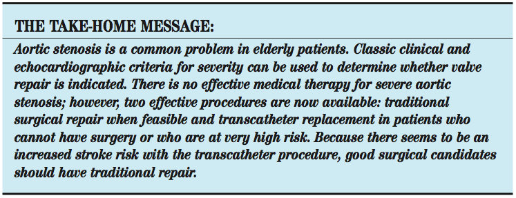 In recent years, a less invasive procedure, transcatheter bioprosthetic aortic valve implantation, has been evaluated in patients who cannot undergo surgery.2,3 Studies have clearly demonstrated that this technique is superior to “medical management” with regard to a variety of parameters, including overall mortality at 1 year, and a variety of cardiac performance measures.3