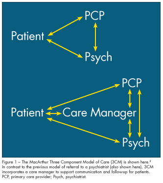 In 1995, the John D. and Catherine T. MacAr thur Foundation organized a multidisciplinary group, including physicians from Harvard University, Duke University, Dartmouth University, and Cornell University, to develop a program to improve primary care management of depression. They created a Three Component Model (3CM) utilizing the USPSTF recommendations, National Institute of Mental Health guidelines, and available evidence to develop a model of care (Figure 1).8 Instead of the previous model of primary care provider referral to a psychiatrist, this model incorporates a care manager to support communication and follow-up for patients. The MacArthur Initiative on Depression and Primary Care provides practical online tools and resources to help enhance the management of depression in primary care.
