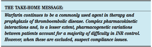 Excellent reviews are available.1 Although the efficacy of warfarin is proven, its complex pharmacology continues to make it somewhat difficult to use. We now know there are several major components to this complexity, including compliance, the use of biologic end points (eg, INR) in clinical therapeutics, very complex pharmacokinetics resulting in drug interactions (even more amplified now in the current era of multiple pharmaceutical use in so many patients) and, lately, the observation of the role of pharmacogenomics in warfarin metabolism. This patient presented with the all too common problem of erratic INR.