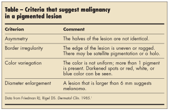 Frequently, these nevi are first noted during the summer because the halo—unlike adjacent normal skin—does not tan. These lesions are usually benign when seen in adolescents; however, use the “ABCD” lesion assessment criteria (Table) to determine whether a biopsy is warranted. In an adult, the development of an isolated pigmented lesion surrounded by a halo can be benign, but excision is recommended to rule out the remote possibility of a halo melanoma.