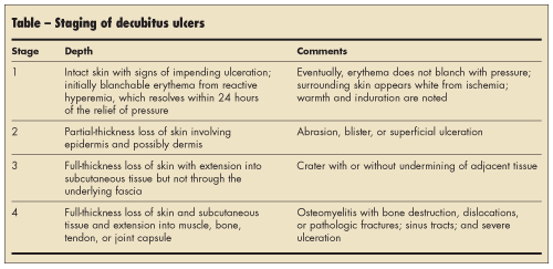 Staging. Decubitus ulcers are categorized in 4 stages based on their depth of penetration (Table).1 Keep in mind that a patient can present with multiple decubitus ulcers in various stages (Figure 1).