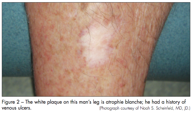 The initial lesions of livedoid vasculopathy, which often appear in clusters or groups, eventually ulcerate over a period of months to years and form irregular patterns of superficial ulcers. When the ulcers finally heal, they leave behind atrophic porcelain-white scars, which are atrophie blanche. Venous stasis and other conditions, such as leukocytoclastic vasculitis, can lead to identical white scars on the legs (Figure 2). Patients who have systemic diseases, such as lupus, rheumatoid arthritis, and Klinefelter syndrome, that can result in skin ulcers may also exhibit atrophie blanche–like lesions. These patients do not have livedoid vasculopathy.