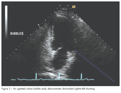 A follow-up 2-dimensional echocardiogram 2 months later demonstrated normalization of RV function. There was a persistent patent foramen ovale, although the degree of right-to-left shunting had decreased significantly (Figure 3).