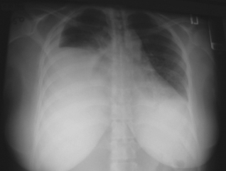 Vital signs and oxygen saturation were normal. The patient had decreased breath sounds with dullness to percussion bilaterally. The chorionic gonadotropin level was 295 mIU/mL. Results of a complete blood cell count, chemistry panel, coagulation studies, arterial blood gas analysis, and urinalysis were within normal limits. A chest x-ray film revealed bilateral pleural effusions, greater on the right.