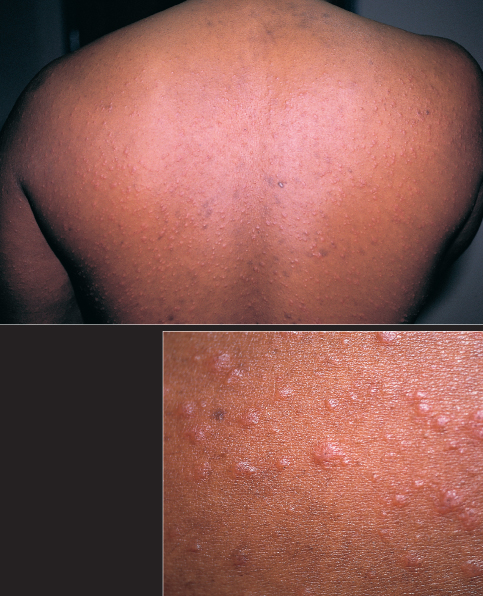 A 31-year-old man seeks evaluation of a pruritic papular eruption on his trunk of 2 weeks’ duration. He denies fever, malaise, and medication use.
