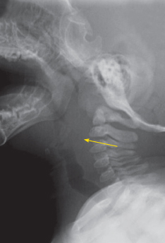 The initial step in the evaluation of an infant or child with a potential deep neck space infection is assessment of the airway for obstruction. When the diagnosis is unclear, plain radiographs may be necessary. In patients with a retropharyngeal abscess, the prevertebral space is wider than twice the anteroposterior measurement of the vertebral body: greater than 7 mm at C2 or greater than 14 mm at C6. The soft tissue inflammation (phlegmon or abscess) may also reverse the normal lordotic cervical spine curvature. When suspi- cion is high, a CT scan with intravenous contrast is the preferred study to assess abscess formation and extent of disease.1