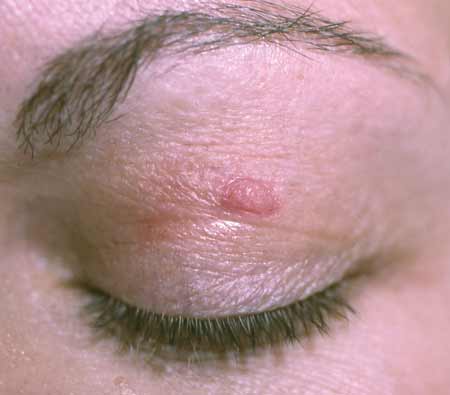 Case 3: A 41-year-old woman was concerned about an asymptomatic, rough-textured growth on her upper eyelid. She has a history of sun exposure but not of skin cancer.