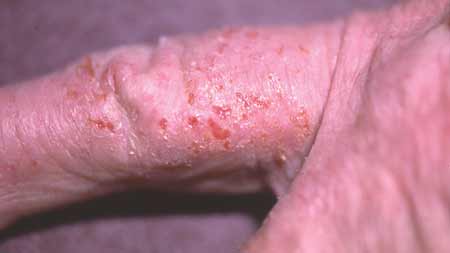 The lesions of herpes simplex are discrete vesicles. Candidal infections are more likely following irritation of the skin. In this case, there was no history of irritation before the symptoms erupted. Contact dermatitis does not typically produce an erosive dermatitis.
