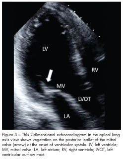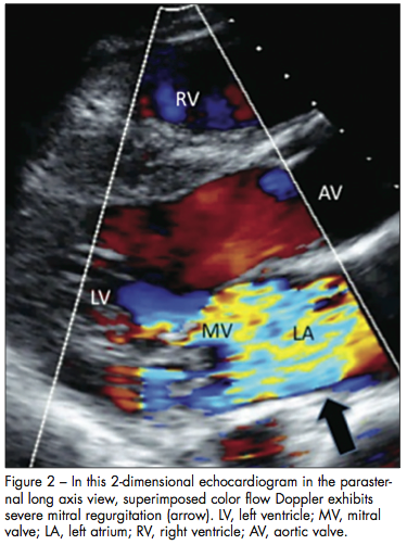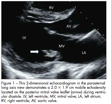 Echocardiographic images are obtained (Figures 1, 2, and 3). They demonstrate severe mitral regurgitation with a mobile, echogenic density on the posterior leaflet of the mitral valve (2.0 by 3 1.9 cm).