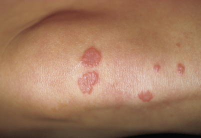 A 28-year-old woman presents with pruritic, tender plaques on her elbows and hands. The lesions first appeared after she began taking an oral contraceptive 4 months ago. The patient is otherwise healthy and uses no other medications.