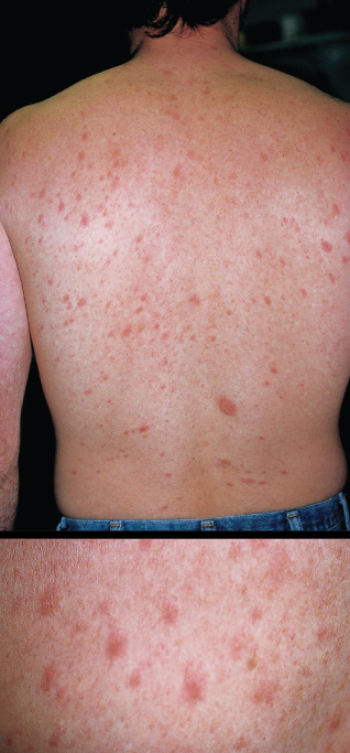 A 34-year-old man has had a progressive, red, pruritic rash primarily on his trunk for several weeks. The rash erupted about 2 to 3 weeks after he had a mild upper respiratory tract illness. The patient takes