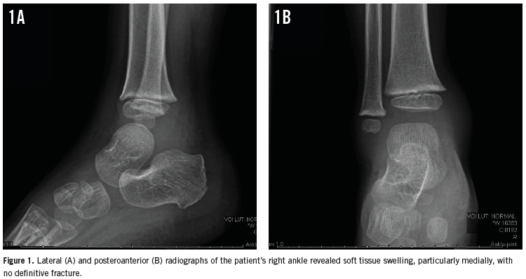 Two days later, he returned to the ER for right ankle pain that had begun after he had descended stairs at home. Radiographs of the patient’s right ankle showed soft tissue swelling but no fracture (Figures 1A and 1B). A preliminary diagnosis of right ankle sprain was made. Out of concern for a possible epiphyseal plate fracture, his ankle was splinted, and he was given ibuprofen for pain and discharged home.