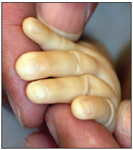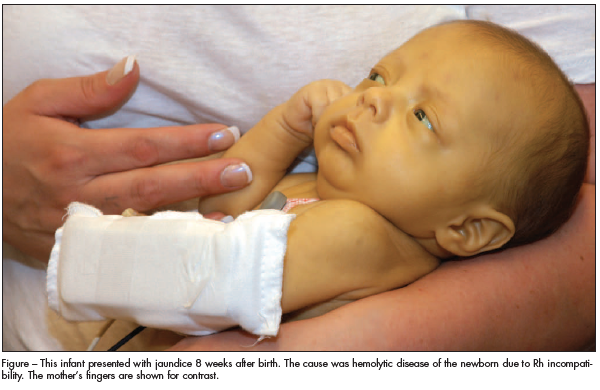 Hemolytic disease of the newborn was diagnosed. The cause was thought to be Rh incompatibility; this autoimmune hemolytic anemia is characterized by hemolysis and unconjugated hyperbilirubinemia. Manifestations of this disease can range from mild asymptomatic anemia and hyperbilirubinemia (Figure) to hydrops fetalis and intrauterine death. Some patients require transfusions during both the prenatal and the early postnatal periods. This patient did not require further transfusions until 8 weeks after birth.
