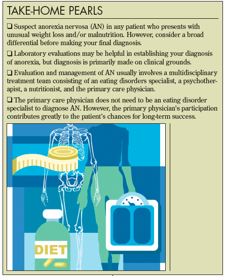 The diagnosis and treatment of AN frequently involves a multidisciplinary team that includes an eating disorder specialist, a psychotherapist, a nutritionist, and the primary care physician. While the primary care physician may not have time and/or expertise to perform a comprehensive evaluation, he or she can play a vital role in manag-ing the nutritional sequelae of the patient's disease.