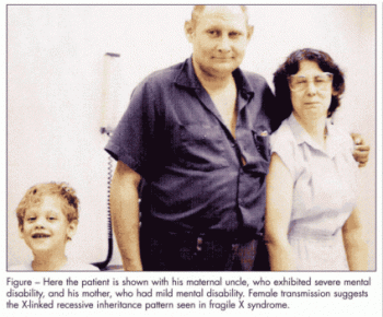 The boy in this case had 600 triplet repeats by DNA testing, which was diagnostic of fragile X syndrome. His mother and uncle declined testing.