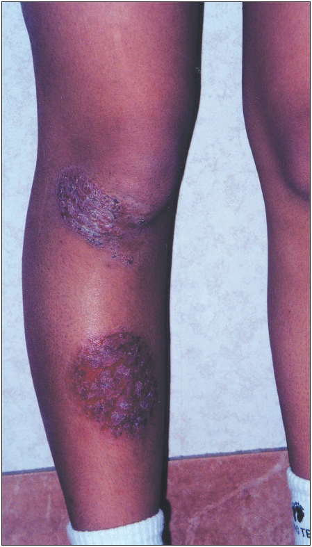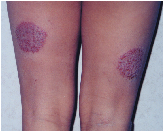 The patient has 2 red, raised, coin-shaped lesions: one on the right knee (3.5 cm in diameter) and one on the right shin (6 cm in diameter) (Figure 1). The plaquelike lesions are dry and cracked, with slight scaling. No central pallor is noted. The nails are normal. There is no joint deformity.