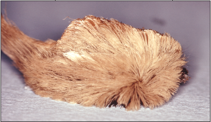 Mature puss caterpillars--which grow to an inch in length--are covered with gray to brown hairs, under which are stiff spines that are attached to glands that contain poison. When touched, these spines break off in the skin, where they cause severe pain.