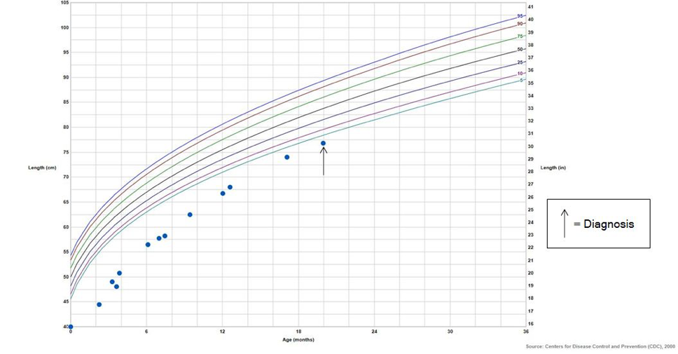History. The boy had no history of fever, change in oral intake, vomiting, urinary symptoms, or change in activity level. The mother said that the patient’s diet consisted of grains, fruits, vegetables, meats, and dairy products. His growth curves showed that his height and weight were both in the 2nd percentile (Figures 3 and 4).