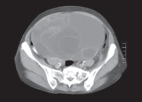 Physical examination. The patient was afebrile, her blood pressure was 170/90 mm Hg, and her heart rate was 104 beats per minute. The hypogastric region was tender with no rebound. Other physical findings were normal.