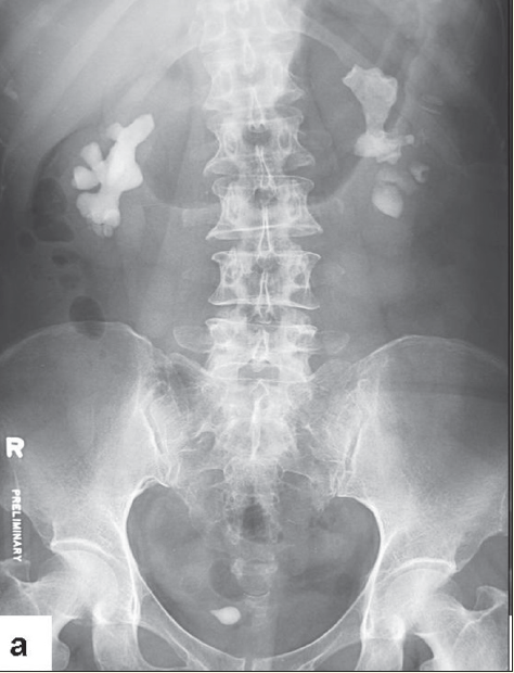 A 48-year-old woman sought medical attention after an episode of gross hematuria associated with mild right-sided loin discomfort. She did not have urinary frequency, urgency, or dysuria. Her history included 3 urinary tract infections (UTIs); a Proteus species was cultured on each occasion. The family history was unremarkable. Other than mild loin tenderness, physical findings were normal.
