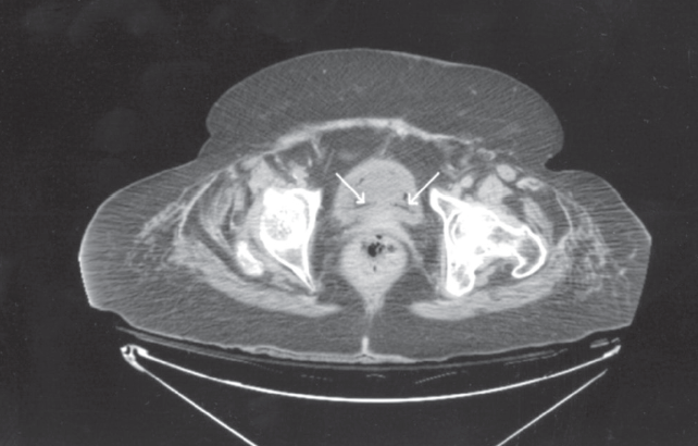 When intraluminal gas is present, other entities, such as a recent urinary tract instrumentation, trauma, and vesicocolic/vesicovaginal fistulas, should also be considered.2,4,5 Clinical presentations range from no symptoms, descriptive pneumaturia, and irritative voiding symptoms to acute abdomen and severe sepsis.2,3 Thus, a high index of suspicion for emphysematous cystitis is required. The condition is usually diagnosed incidentally by plain abdominal film, ultrasonography, or CT scan findings. Other modalities include direct visualization during cystoscopy or laparotomy and biopsy. 2,3