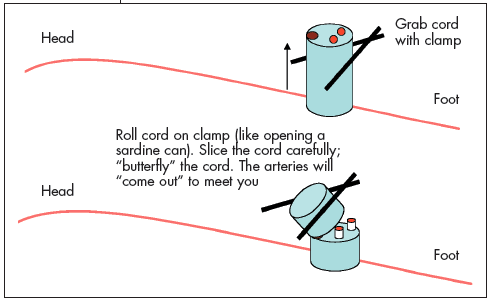 "Those who use this technique might want to cross-clamp the umbilical stump more than 0.5 to 1 cm above the skin line. This will make it easier to position the vessels and leave extra length in case of vessel wall perforation."