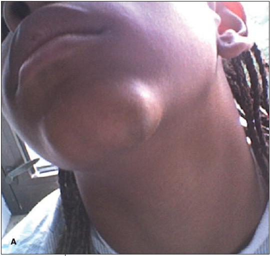 The differential diagnosis of this patient's chin mass included, in addition to cystic hygroma, chin abscess, brachial cleft cystic lesion, lymphadenitis, and teratoma. Because the classic manifestation of cystic hygroma-a soft, compressible, transilluminating, loculated, illdefined mass that is not attached to the skin but movable across deeper tissues-is not always present, diagnosis based on clinical findings alone is unreliable.7 Results of CT, MRI, or ultrasonography can help define the relationship between the lesion and neighboring structures. However, only pathological examination of the excised mass can definitively confirm the diagnosis.