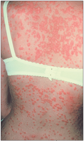 This teenager had a very severe sore throat approximately 2 weeks before her rash suddenly developed. She had been taking penicillin. Her pediatrician thought the rash was a drug reaction and discontinued the therapy. Nevertheless, the rash has persisted for over 4 weeks after the drug was stopped, and the girls' parents are concerned.