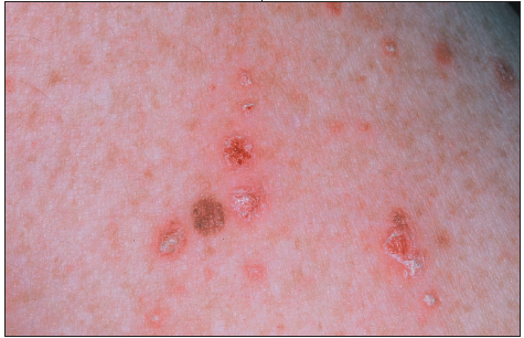 Case 2: This young girl has a generalized papulosquamous eruption made up of multiple 3- to 7-mm papules that spare the palms and soles. There is a fine white scale over the surface, which, when removed, shows pinpoint bleeding on the papule surface (the Auspitz sign). Her mucous membranes appear normal. The clinical diagnosis is guttate psoriasis.