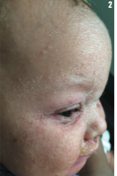 At presentation, the infant was also fussy but consolable. He had a mild cough and clear rhinorrhea, but he exhibited no respiratory distress, drooling, or difficulty swallowing. His eyes were not red, and he was afebrile. The boy’s vital signs were unremarkable, but physical examination results showed a diffuse, erythematous rash over the face, which extended to the scalp and ears. He had crusting over the eyelids and around the mouth and nose, with mild swelling concentrated in the orofacial region (Figures 1 and 2). There were yellow-crusted scabs with mild bleeding under the nares. Circular, hyperpigmented lesions were noted on the occiput, posterior trunk, right thigh, and right arm (Figure 3) with mild surrounding erythema. The lesions in these areas varied in size from 2 to 3 cm, and the skin within these lesions was thickened and scaly, with areas of weeping and purulent discharge.
