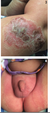 A presumptive diagnosis of staphylococcal scalded skin syndrome (SSSS) was made, and the patient was started on intravenous clindamycin 40 mg/kg/day every 6 hours. Staphylococcus aureus remains the most common cause of skin and soft tissue infections, with phage group II strains (Types 3A, 3B, 3C, 55, or 71) producing exfoliatins A and B, serine proteases selectively targeting desmoglein 1, an adhesion molecule within desmosomes in the stratum granulosa. Subsequent cell separation clinically manifests as flaccid blisters that slough off, leaving the underlying skin erythematous and denuded, which is the characteristic appearance of the skin (ie, scalded).1-4 Risk factors for developing SSSS include age, socioeconomic factors, overcrowding, azotemia, immunosuppression, viral infections, and antibiotic use. The most significant risk factor is disruption of intact skin. Children under 5 years of age, especially infants and newborns, are at an increased risk for SSSS due to insufficient time to develop specific lifelong antibodies to staphylococcal toxins and immature renal clearance. However, the prognosis in children is good relative to adults.3,4