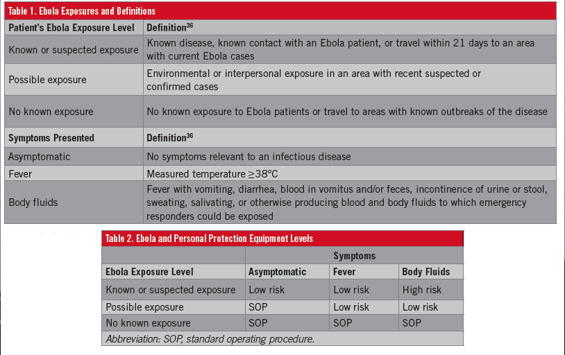 Staff members at outpatient clinics, physician’s offices, public health clinics, and hospital centers should be on the alert for individuals who might have EVD (Table 1).36 A patient with a febrile illness might have an infectious etiology other than Ebola, but one should ask whether during the previous 21 days the individual has traveled to a country known to be having an Ebola outbreak. If so, these measures must be taken immediately: Isolate the patient; avoid unnecessary contact with individual; wear personal protection equipment (PPE); inform the health department; and organize transfer to a specific facility able to evaluate, diagnose, and, if needed, treat the patient. Under no circumstances is the patient to be transported to another facility unless public health authorities have been notified.
