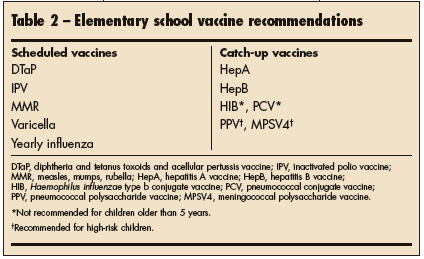 As advocates and implementers of the vaccine program, pediatric caregivers are obligated to keep up-to-date with the ever-changing vaccine recommendations and requirements for the elementary school- aged child.