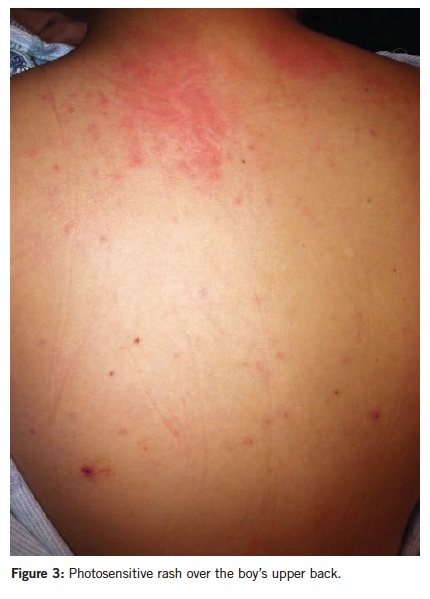 An 11-year-old boy was referred to our hospital with 2-week history of fever, pancytopenia, and rash. The rash had developed on his face one month prior to presentation, and the child had been started on benzoyl peroxide for suspected acne. Despite this treatment, the rash continued to progress and involved the ears, shoulders, back, and forearms. He was prescribed oral acyclovir because of concern for eczema herpeticum. The boy then developed fevers, generalized myalgia, fatigue, and knee pain.