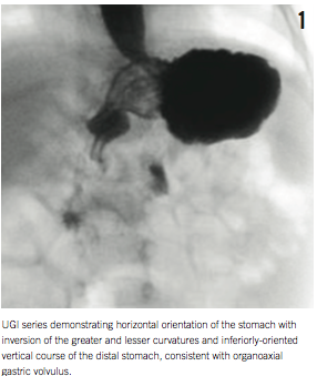 Gastric volvulus presents in both acute and chronic forms. Although gastric volvulus is a rare condition,1-4 the diagnosis should be considered in pediatric patients in the appropriate clinical setting. Presenting symptoms are nonspecific and resemble those of more common pediatric diagnoses, and delay in diagnosis has been associated with significant morbidity and mortality.1,5
