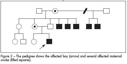 Figure 3 shows this patient's maternal male relatives, with coarsened facial appearance and skeletal changes that have been likened to those of gargoyle statues. The pedigree provides strong evidence of X-linked recessive inheritance by male-only affliction, lack of male-to-male transmission, and linkage of affected males through females (female carriers) (see Figure 2). The 2 X chromosomes in females allow them to "carry" an abnormal allele on 1 X chromosome that is compensated for by a normal allele on the companion X. In future pregnancies, carrier females have a 1:2 or 50% risk that any son will be affected with Hunter syndrome and a 1:2 or 50% risk that any daughter will be a carrier.