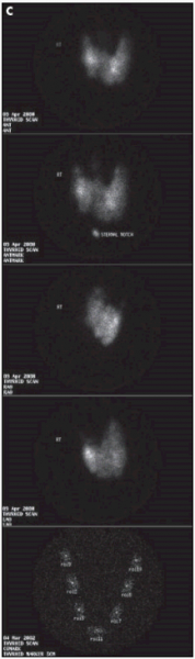 Additional laboratory tests showed that her thyroid-stimulating immunoglobulin levels were within normal limits; however, her thyroid peroxidase antibody level was 38.3 IU/mL (normal, 0 to 10.1 IU/mL), and her antithyroglobulin antibody level was 47.4 IU/mL (normal, 0 to 28.7 IU/mL). Radioactive iodine(Drug information on iodine) (123I) thyroid uptake was elevated at 6 and 24 hours, with values of 57% and 69%, respectively; and a thyroid scintography scan showed homogeneous tracer uptake consistent with Graves disease (C).
