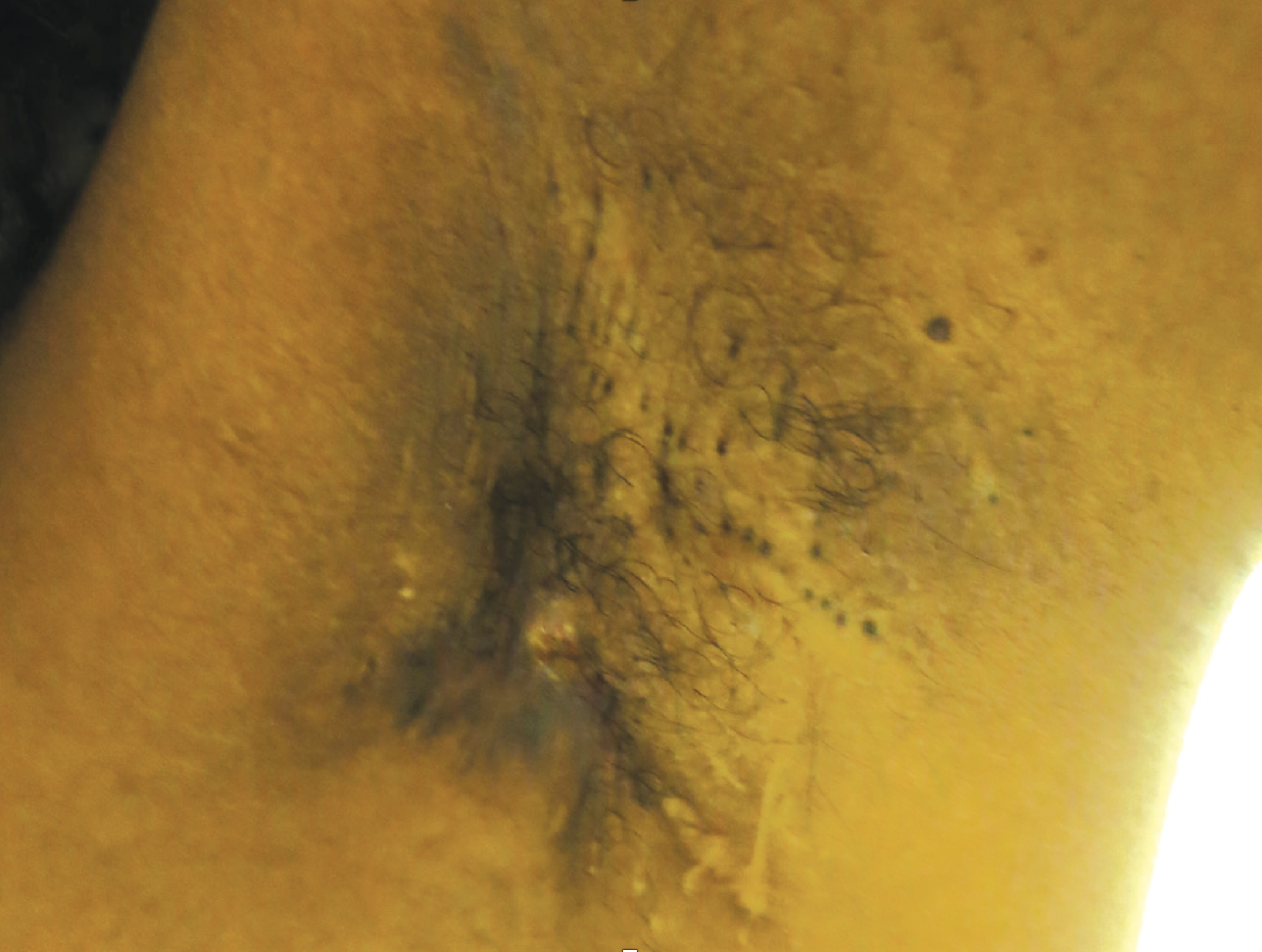 The patient was transferred back to the United States for continued medical care. One month after discharge, Dermatology evaluation revealed scarred sinus tracts in bilateral axillae without active inflammation or infection. Her current treatment regimen consists of daily oral doxycycline, benzoyl peroxide, and silver sulfadiazine as needed on active lesions. Future treatment considerations include laser hair removal and adalimumab.