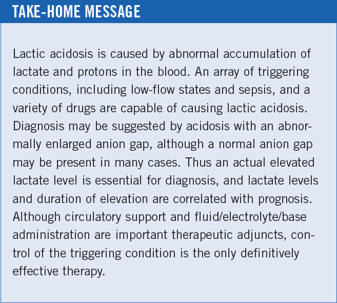 The patient presented here is manifesting lactic acidosis, an extremely morbid and dangerous acid-base disturbance. In lactic acidosis, a disturbance in the pyruvate-lactate metabolism results in an increase in lactate production (and proton generation in an equivalent amount) that exceeds the body’s capacity to consume the lactate and to balance the excess protons via available base in the form of bicarbonate. A wide variety of disorders can trigger this process, but this array can be sorted into 3 major pathophysiologies: