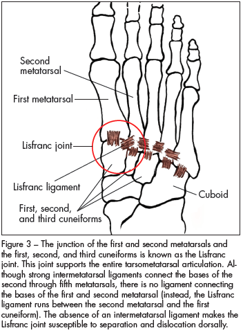 The Lisfranc joint is susceptible to separation and dislocation dorsally because no intermetatarsal ligament runs between the bases of the first and second metatarsal (see Figure 3). There are strong intermetatarsal ligaments between the bases of the second through fifth metatarsals that provide a significant amount of dorsal stability (see Figure 3). A strong ligament (called the Lisfranc ligament) runs between the medial cuneiform and the base of the second metatarsal. This ligament, which runs in a plantar direction, stabilizes the second metatarsal in its mortise. However, the joint capsule and dorsal ligaments provide minimal--and the only--support on the dorsal surface of the Lisfranc joint. The bony architecture of this joint is the focal point that supports the entire tarsometatarsal articulation. Its anatomy constitutes a "weak link" that with stress is prone to injury.3,4