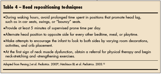 Recommend strict adherence to the repositioning techniques outlined in Table 4 at the first sign of any occipital flattening.2 In more severe or persistent cases, helmet therapy or, rarely, surgery may be required. Craniofacial surgeons and pediatric neurosurgeons have the crucial role of determining the optimal management for a particular patient. Molding helmet therapy may be necessary if repositioning and physical therapy do not improve the situation. Keep in mind that helmet therapy is most effective in infants between 4 and 12 months9 of age. Such therapy may be a more effective initial treatment than repositioning,13 but there is no consensus yet.19