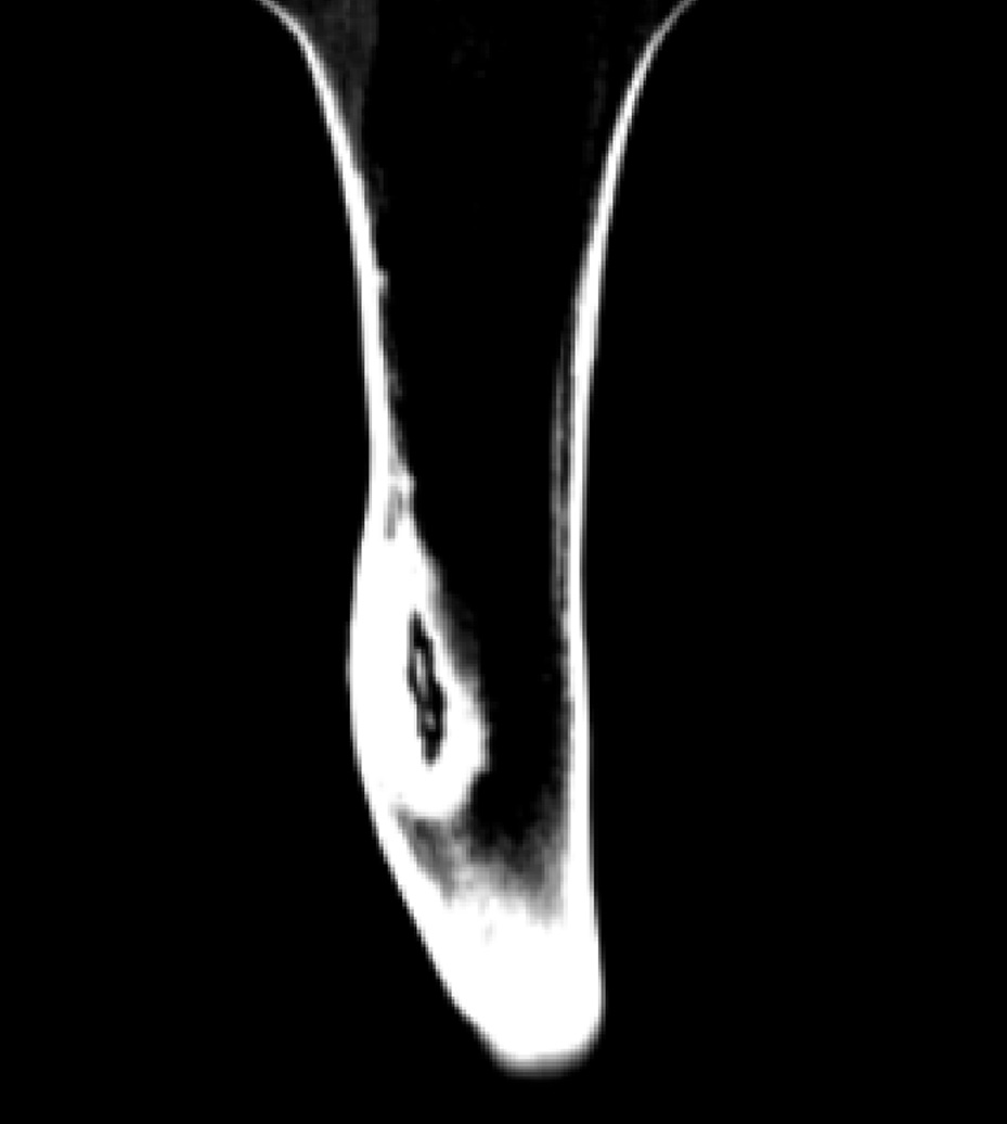 Radiographs show an area of cortical thickening and sclerosis. A lucent nidus is seen in 85% of cases.3 Other imaging modalities (eg, technetium-99m scan) are helpful when the lesion is not clearly demonstrated on plain radiographs.1 CT scans can help identify the nidus within the radiologically dense reactive zone around it and help differentiate it from chronic osteomyelitis. MRI findings show marrow and soft tissue edema, which can be confused with malignant tumors or osteomyelitis.4
