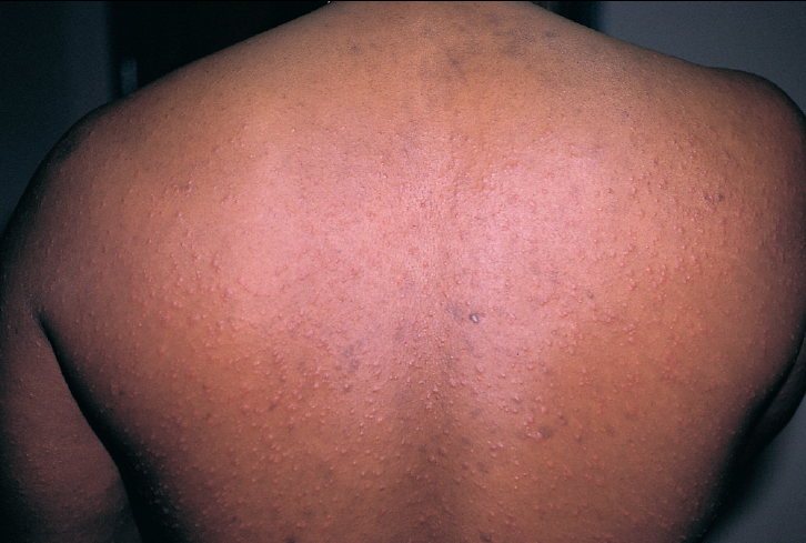 A 31-year-old man seeks evaluation of a pruritic papular eruption on his trunk of 2 weeks’ duration. He denies fever, malaise, and medication use.