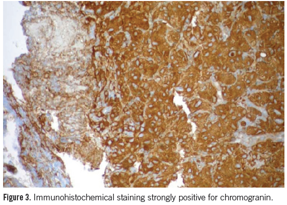 The patient was seen by oncology and thoracic surgery consultation services. The patient had a core biopsy of the left adrenal mass prior to hormonal assessment. The pathology was consistent with pheochromocytoma with immunostains for synaptophysin and chromogranin strongly positive (Figure 3). The endocrine service was alsoconsulted.