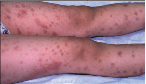 THE CASE: A 10-year-old girl has had a worsening rash for 1 week. The mildly pruritic, nontender eruption initially appeared on the child's thighs and then spread to the arms and face. The child's right hand, feet, and ankles have been swollen for the past 4 days, which has made ambulation intermittently painful.